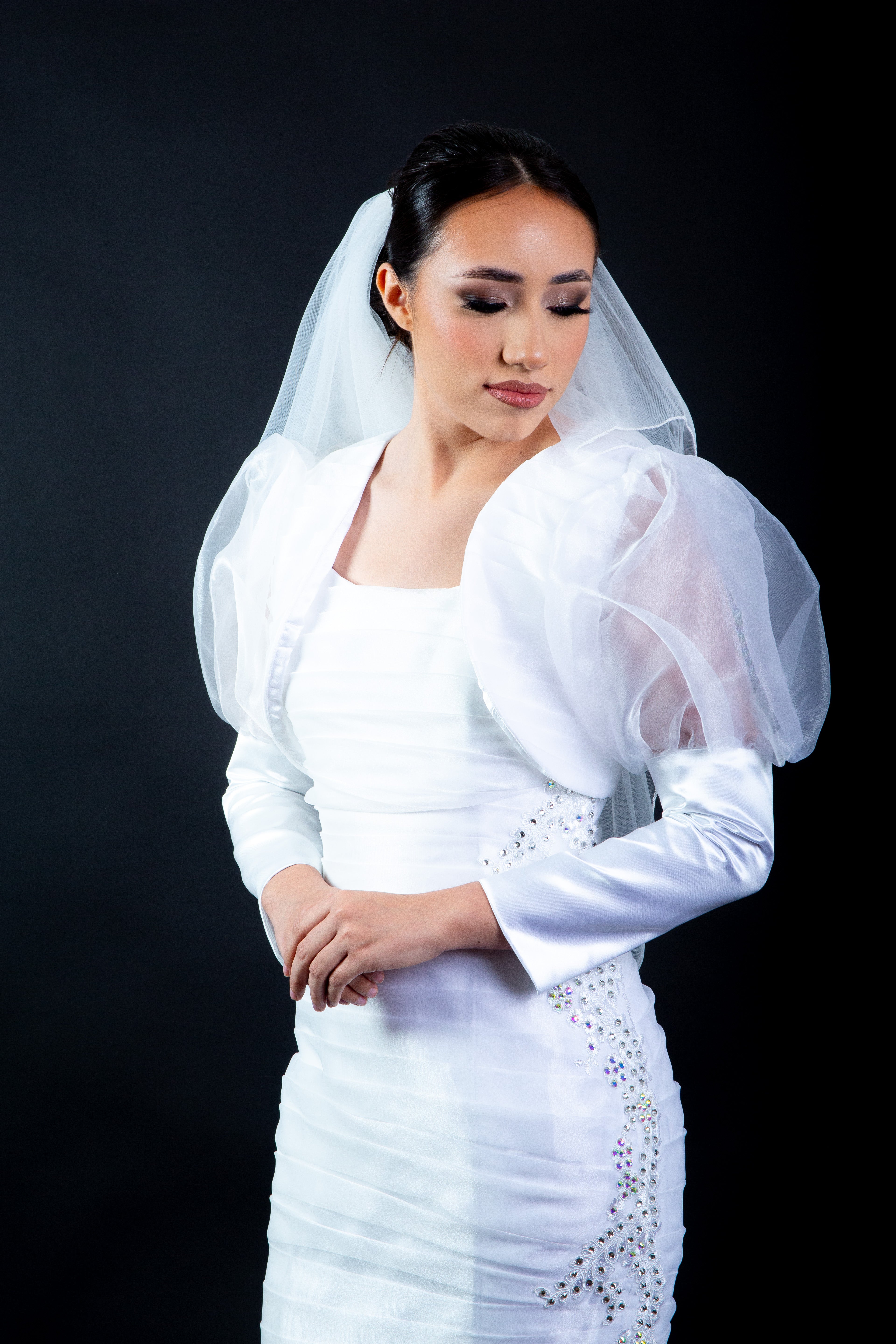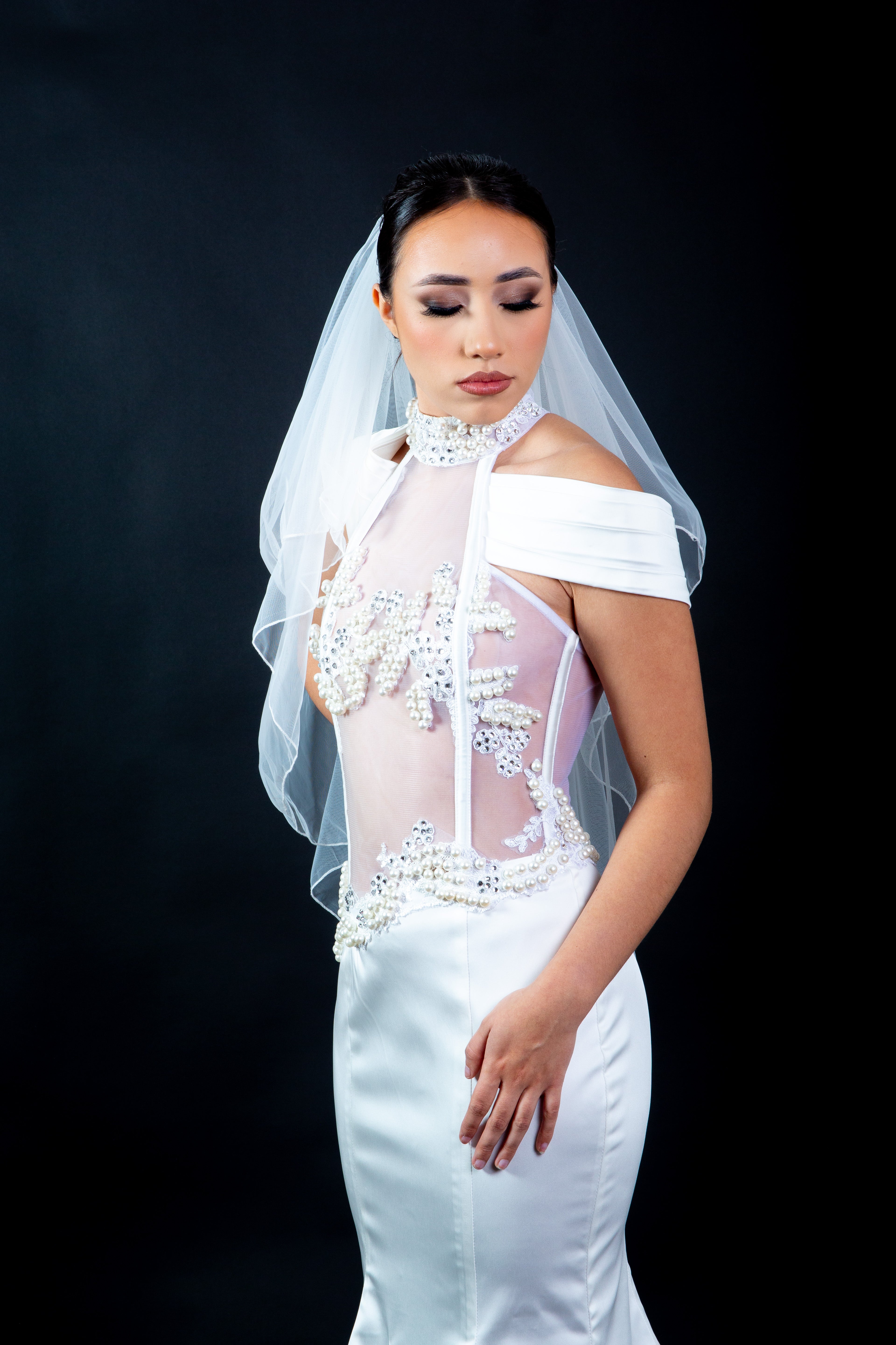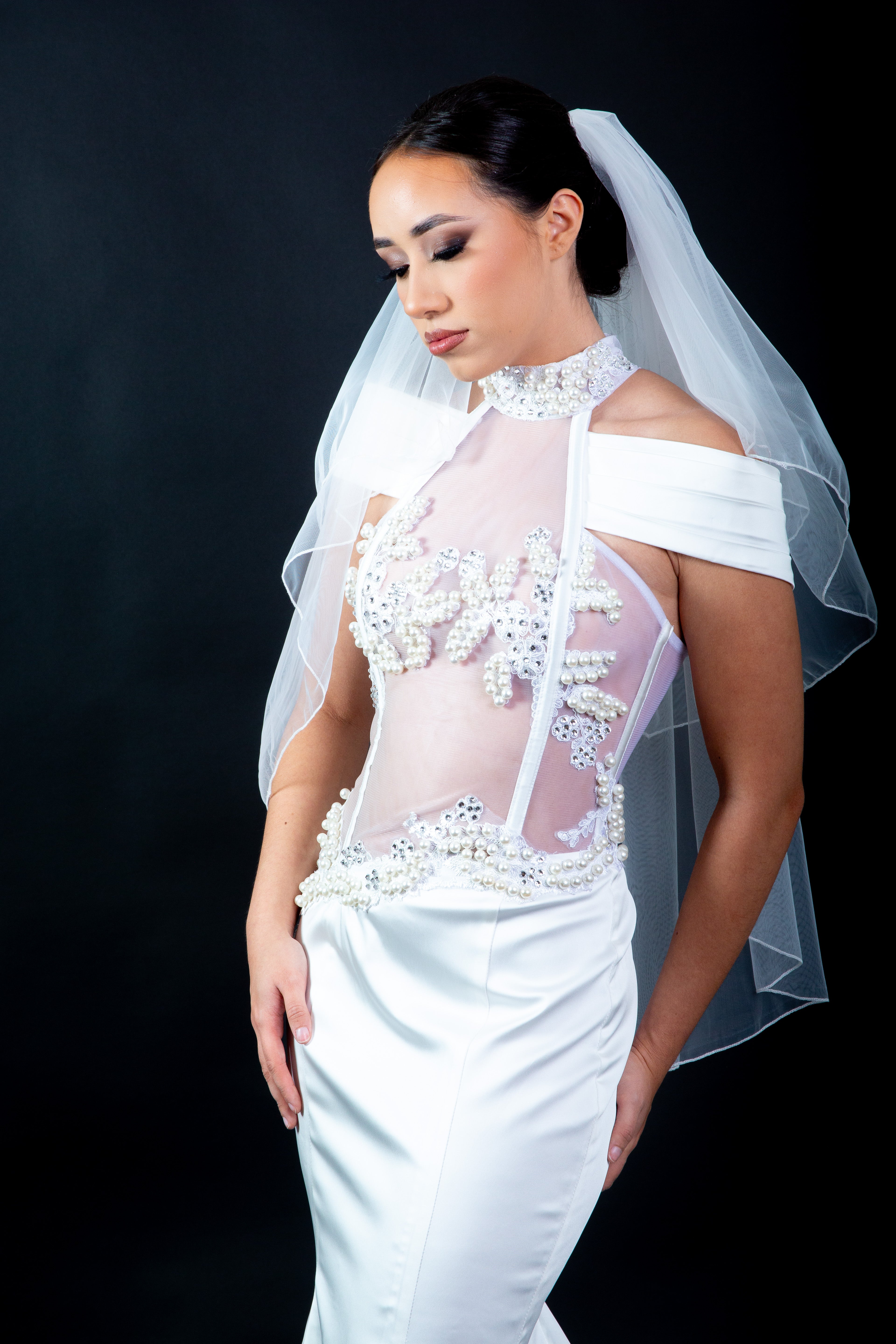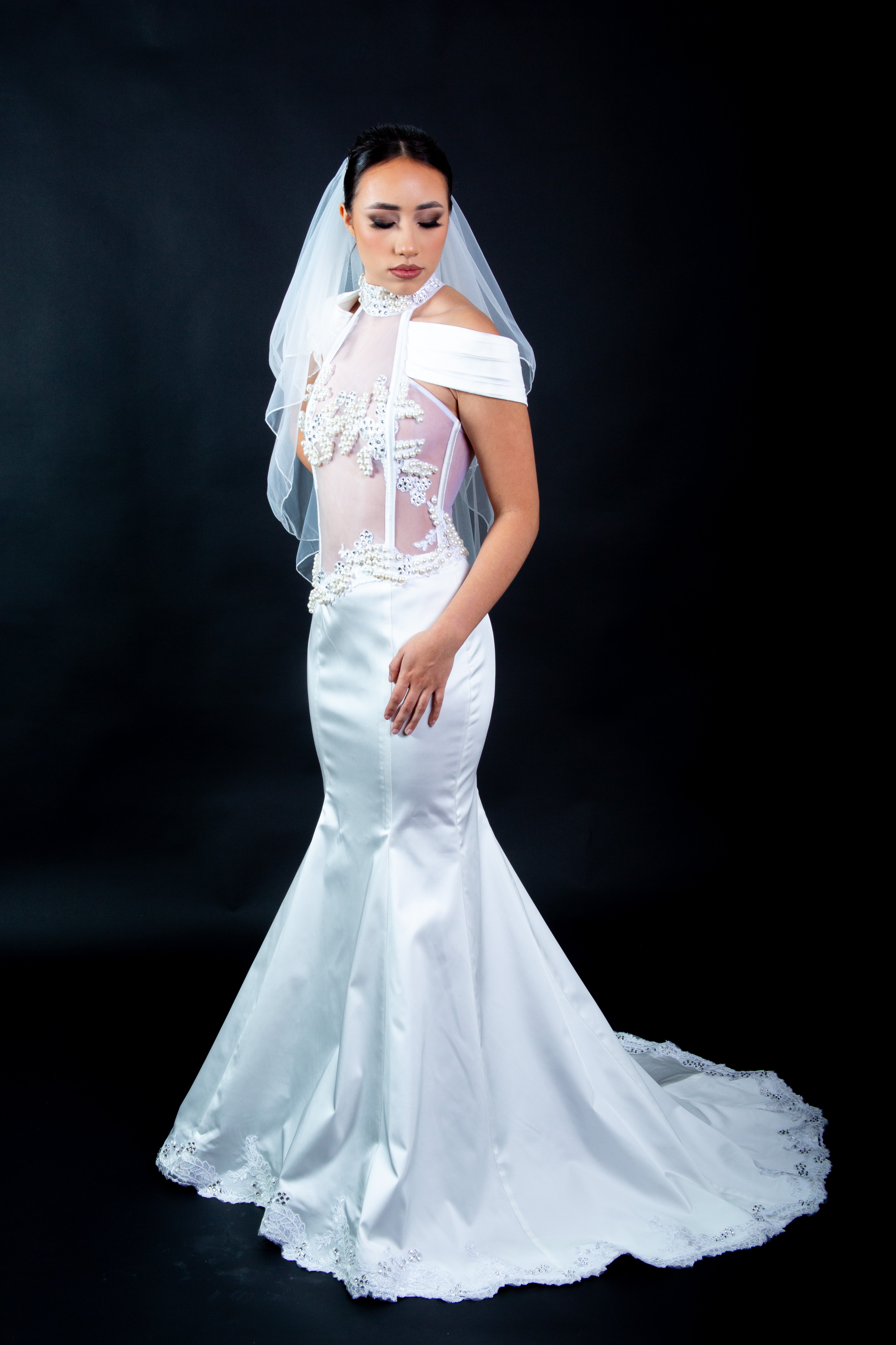 A White bridal dress by Daniel Gram, custom-made to highlight your elegance for any special occasion. Sophistication, style, and perfection tailored just for you.